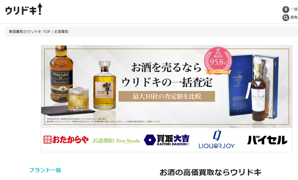 - 広範: ウイスキー以外にもブランド品や貴金属をまとめて売却可能。